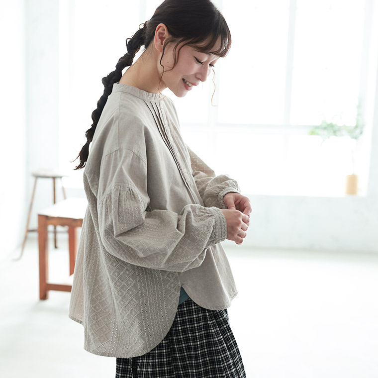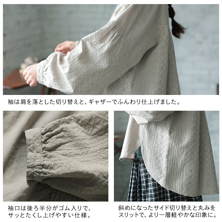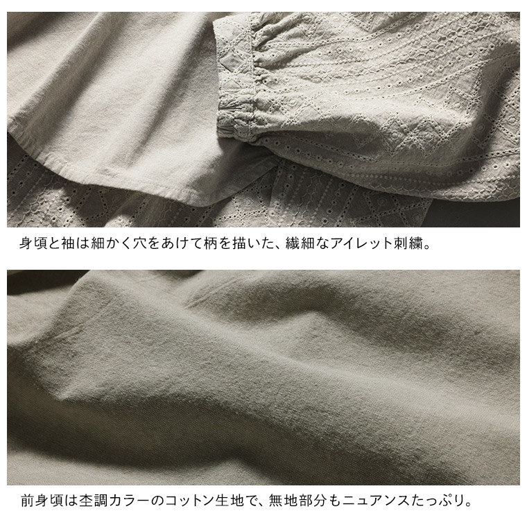 繊細なアイレット刺繍をふんだんにあしらったブラウス。
