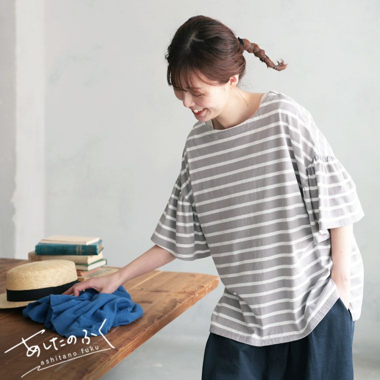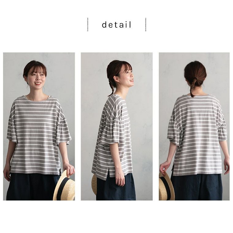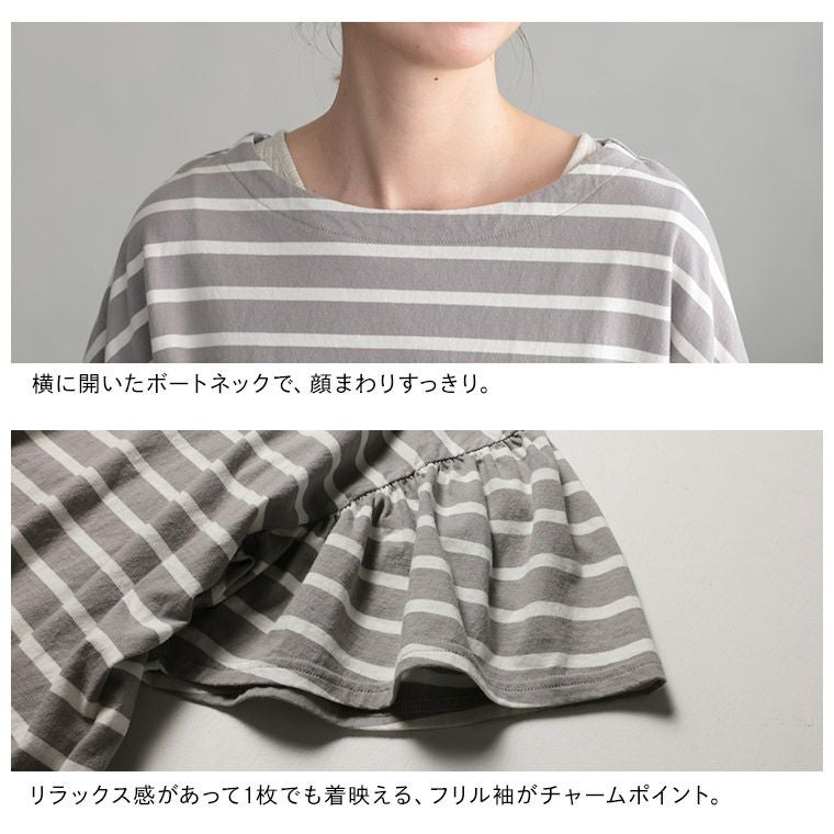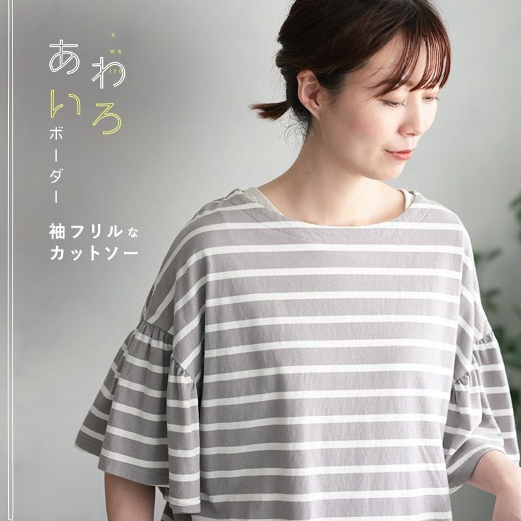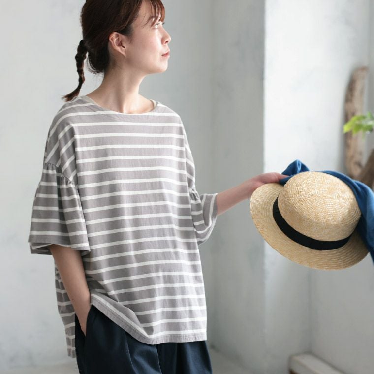 あわいろボーダーの袖フリルカットソー