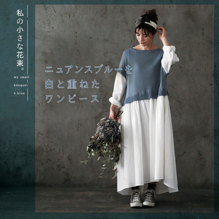 私の小さな花束。ニュアンスブルーを白と重ねたワンピース