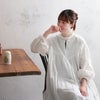 「はちみつ堂の白いワンピース」を購入したので悩みましたが、かわいさの誘惑に負けてこちらも購入することに。 骨ストで上半身にボリュームがあり胸も大きめの私だと、肩位置を落とした方がかわいく見える事が分かったので 最近はわざと1サイズアップにハマっているのですが こちらは身幅も大きく 上位置切り替えの贅沢な全周ギャザーの為、膨らんでしまいました。 返品期限ギリギリまでサイズ交換を考えましたが、やっぱり肩位置は落とした方が良かったのでこのままに。 試しに脇下あたりを手で摘んでみたらシルエットがとてもかわいくなったので、気になるようなら自分で調節しようと思います。 ふわっと甘さ全開ですが、着てみると肩周りはスッキリしているので想像ほど甘々ともしていませんでした。 ギャザーたっぷりですが ベストや上着と合わせてももたつく事もないです。 細かいことを言えば私の体型の問題かもしれませんが 襟下のスリットが入っている部分の生地が 襟の重みに耐えきれずにたわんでしまい 横向きに変なシワが入るのが少し残念くらいで 身幅だけではなく袖まで繋がるように入ったV字ラインがとにかく美しいです♡ はちみつ堂(いつものサイズ)と、シロフクロウ(1サイズアップ)の白ワンピを比べてみた感想も書いておきます。 両者を平置きで重ねてみたところ 色、生地の厚さ、肌に乗せた時の透け感、着丈、袖丈、 袖の切り替え位置は違うのに袖のボリューム感や袖のシルエットはほぼ同じでした。 両者とも袖長めですが、まくればぽわんとかわいくなるので問題なさそう。 細かい違いはハチミツはつるっとした適度にハリのある生地で、首まわりにゆとりがあり。 フクロウは少しザラっとしたようなシワ加工生地でほんの少しハリがあるため 透け感が気持ち軽減されていて、裾幅が少しだけ広いくらい。 比べてみて驚くほどベースに大きな違いはなかったので 生地感、切り替え位置やシルエットの見た目のデザインのお好みチョイスで良さそう。 サイズはハチミツはアップでもダウンでも、好みでどちらでもOKですが フクロウはダウン一択で、可能なら2〜3サイズいっても大丈夫そうな印象です。 いつも以上に長々とすみません。 サイズ違い購入なので参考にならないかもしれませんが、誰かの参考になれれば幸いです。