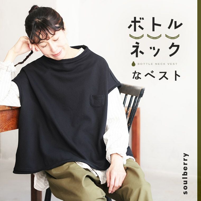 スウェット生地なので着やすさ間違いないだろうと購入。ボトルネックが程よく高見えしてくれ、バックスタイルがポアんとたまりが出来て、着ると予想以上にかわいいベストです。 黒なんで、絶対使えます。夏は長めの半袖と組んでも可愛いかも。