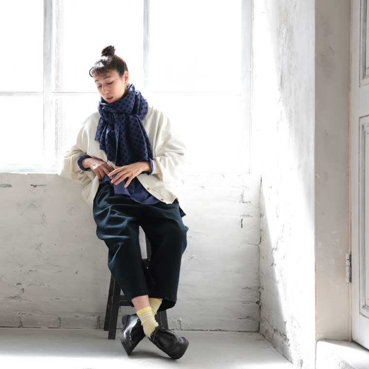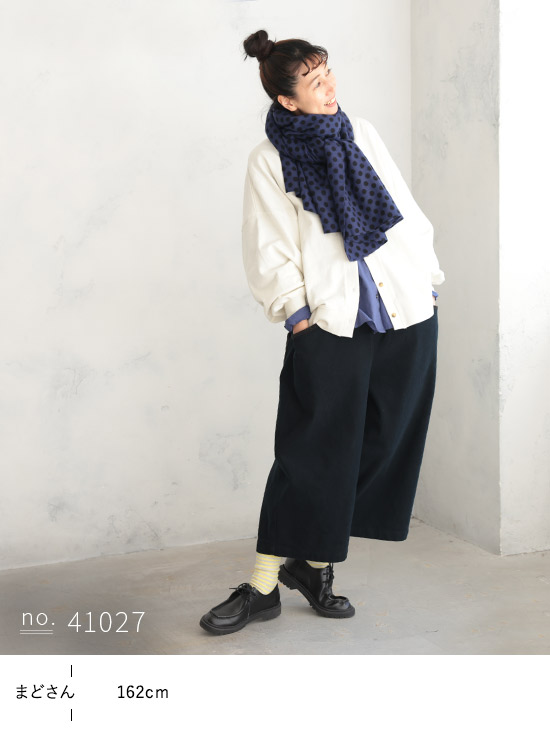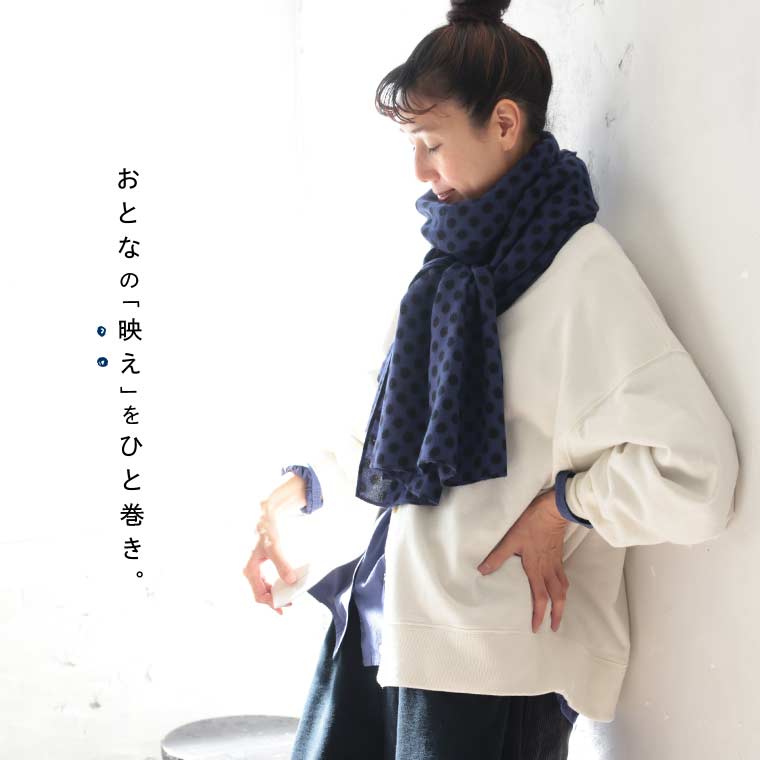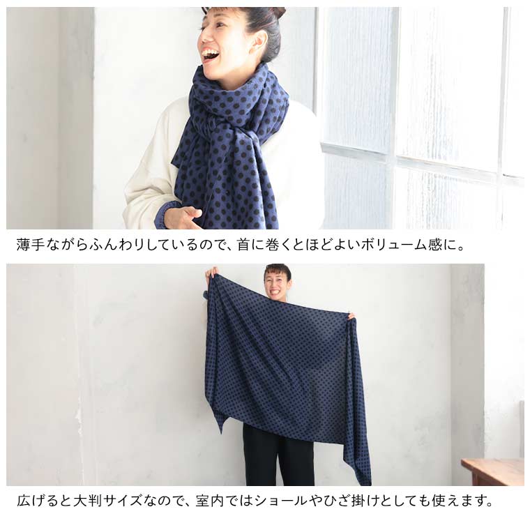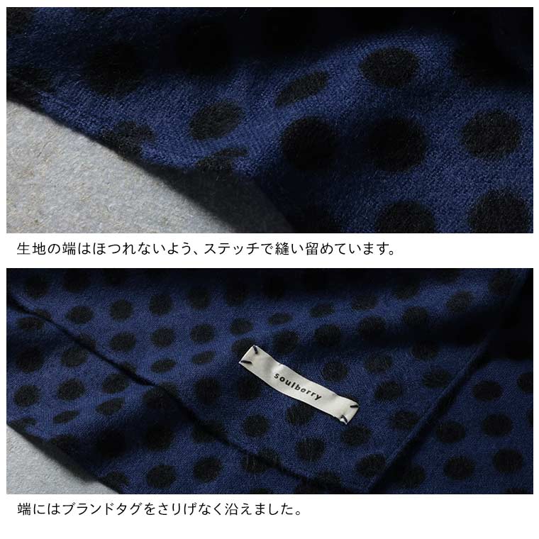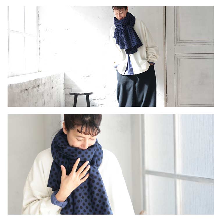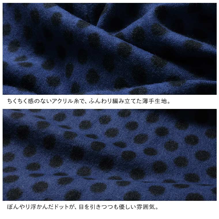 落ち着いたブルーに黒のドットが映えます。暖かくて柔らかいてす。長さがあるのでアレンジできそうです。アクリル100…静電気が心配です。