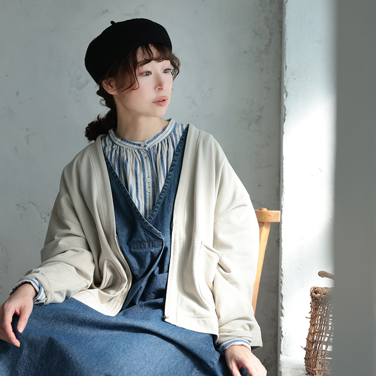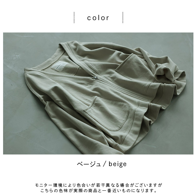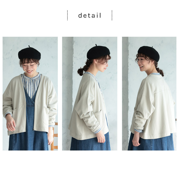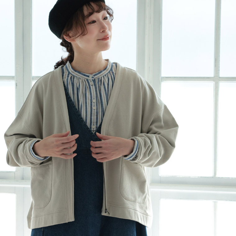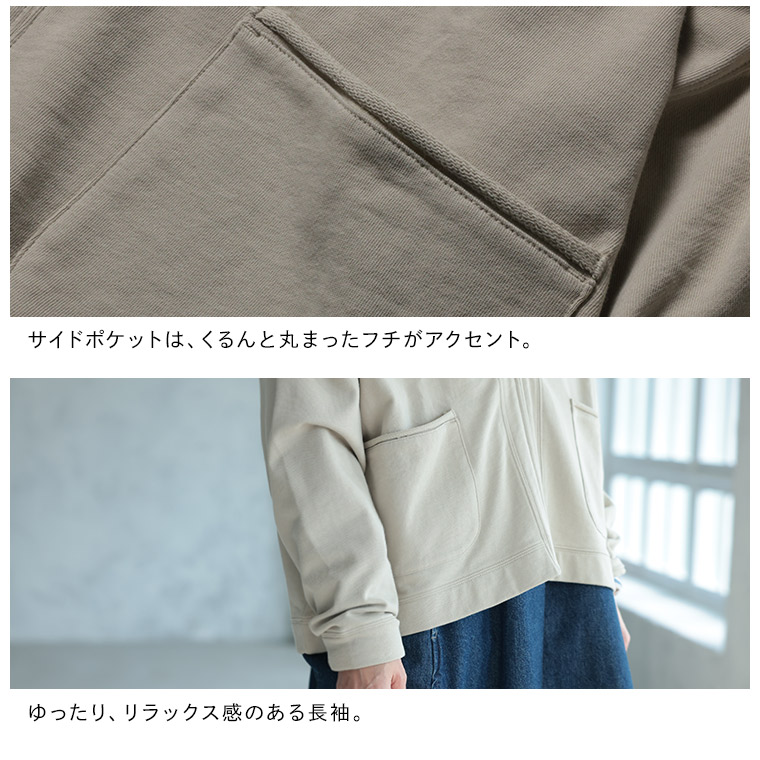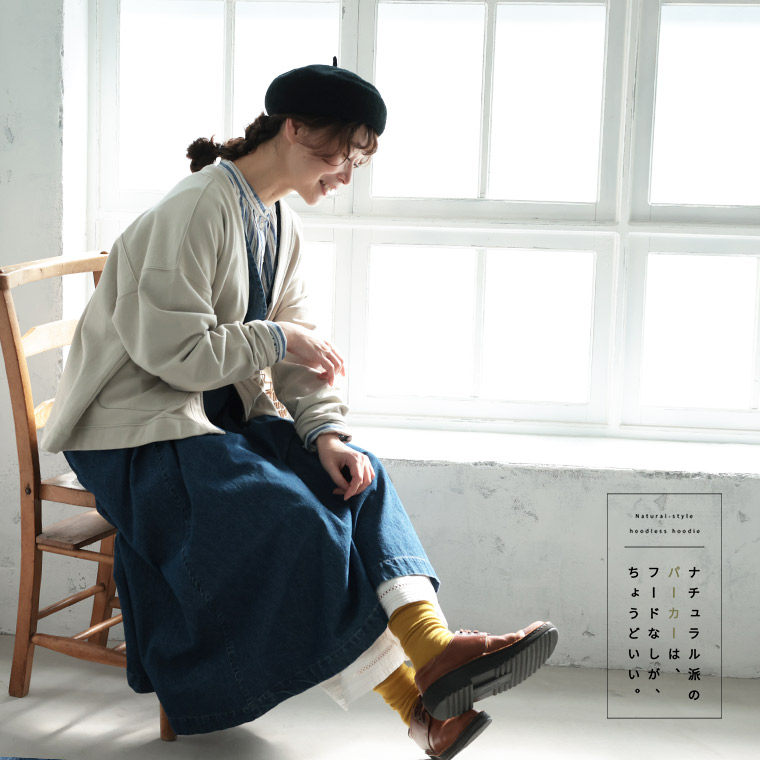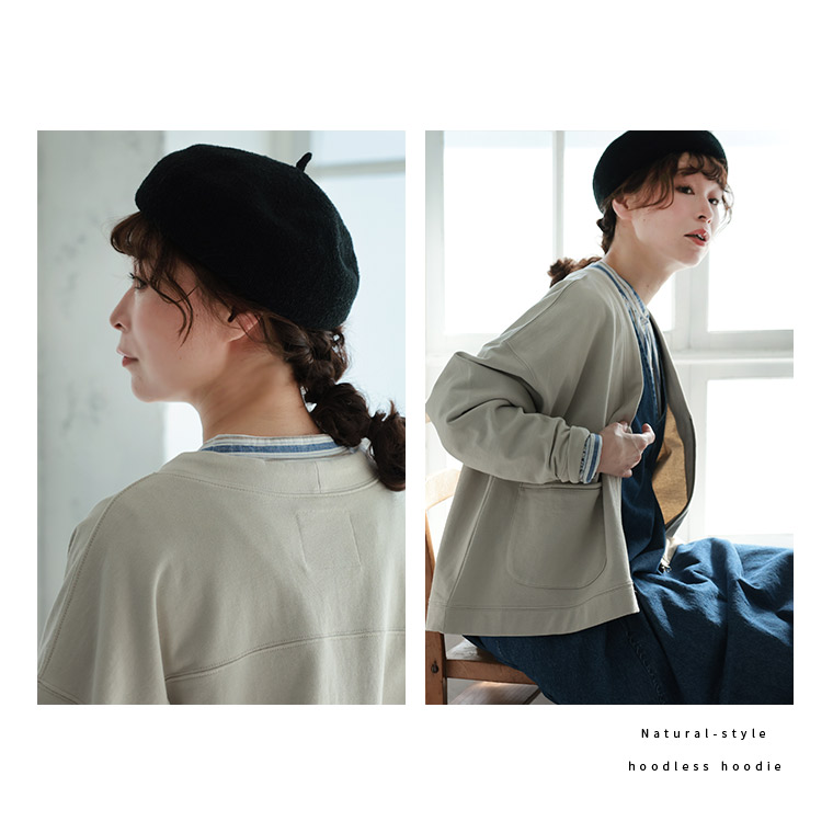 ナチュラル派のフードなしパーカー