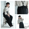 ワイドシルエットにあえて小さめの胸当て、華奢な肩紐。