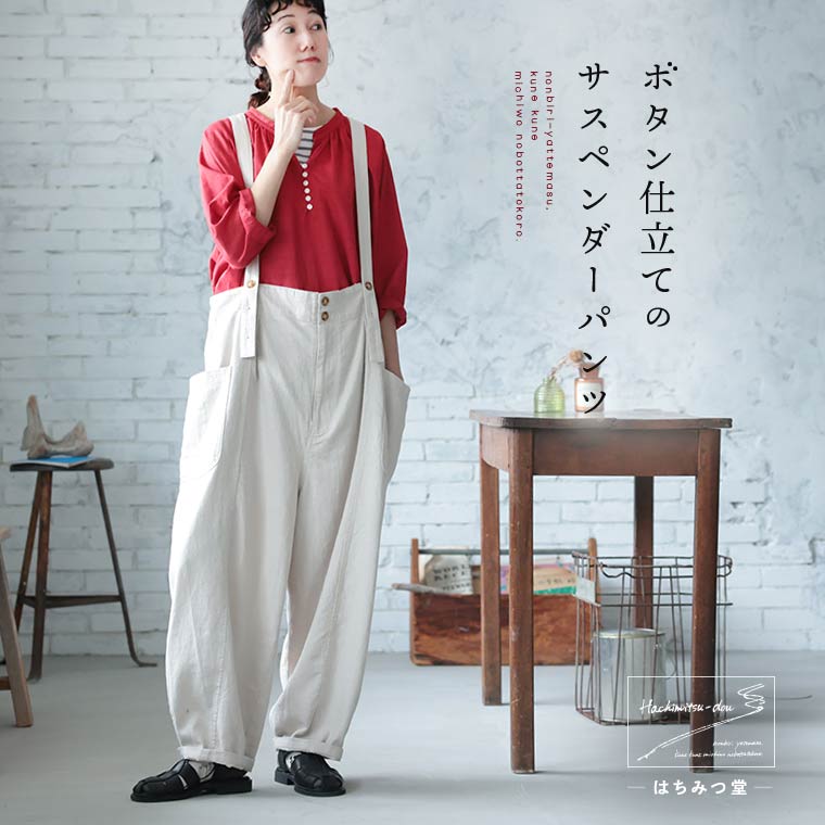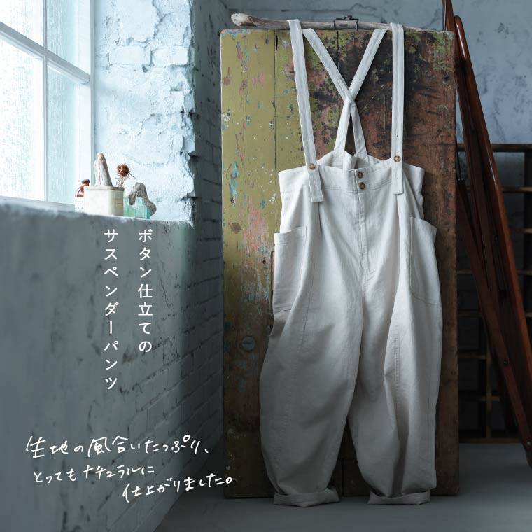 ボタン仕立てのサスペンダーパンツ