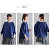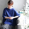こんなベーシックなPOが大好きです。 ほぼ画像通りの素敵色で「あさがお」って表現がぴったり。 生地もしっかりしていて、着心地やシルエットも良いです。 まいちゃんさんは袖をロールアップして着用されていて、 しっかり伸ばした状態の着用画像がないのがちょっと残念でした。 実際は9部くらいの長めの袖で袖口も広いので そのまま着ただけではちょっともっさりとしたシルエットになります。 幅広の見返しの分と同じだけ綺麗に折り返したり ルーズにロールアップして着用するとこなれる、ロールアップありきな感じでした。 あと襟ぐりがボートネックのように横に広めなので インナーの色や柄をチラ見せして 遊べるところもかわいいです。