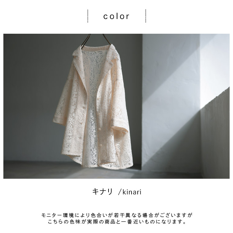 ノースリーブ物とかに合わせる夏用の羽織がどうしても欲しくて購入しました。私が着たらカーテンみたいって言われるんじゃないかってw正直買うのかなり迷いました!あと腕に直接触れる分チクチクしないかな…とか。不安もありましたが大丈夫でした!生地は柔らかいです!いつものサイズでOKでした!着た感じも短くも長くもなく不安な所を絶妙に隠してくれる感じです! とても素敵です!ただやっぱり何かに引っ掛けたら怖いwそこだけ気をつけなきゃ!!これだったらブラックもあったら欲しいですね!!