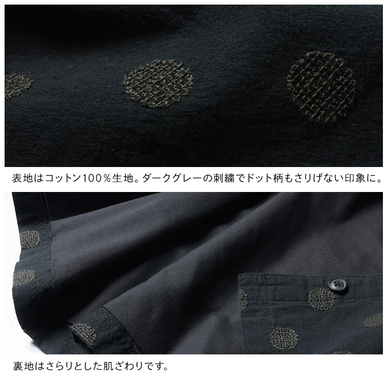 大人ドットでさりげなく可愛いです。生地もしっかりしていて良いです。Lで注文しましたがゆったり脇なのでMでよかったかもしれません。これからの秋冬にボタンを前にしたり合わせて活用したいと思います。