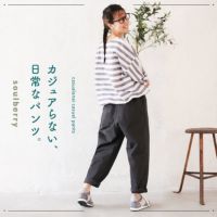 160cm、75kg、バスト小さめ、お腹太め、足は長めです。 ソウルベリーさんではトップスM 、ボトムLLか3L、普段は上下ともに3Lが多い体型です。 こちらはLLサイズでちょうど良かったです。 つるつるした肌触りの良い綿パンツです。 ふっくらしてるので、かぜとおりがよく夏でも意外に涼しく履けそうと思いました。 先がちょっとすぼまってるのでかわいいシルエットです。 7分よりはあるかな〜くらいの丈感でした。 あまり履いた事ないデザインなので、歩くと裾が上下するのにまだ慣れません。 -